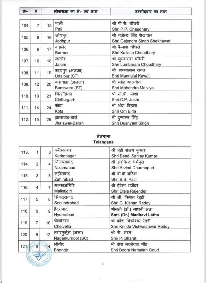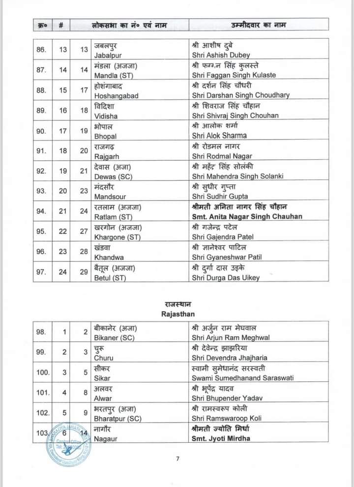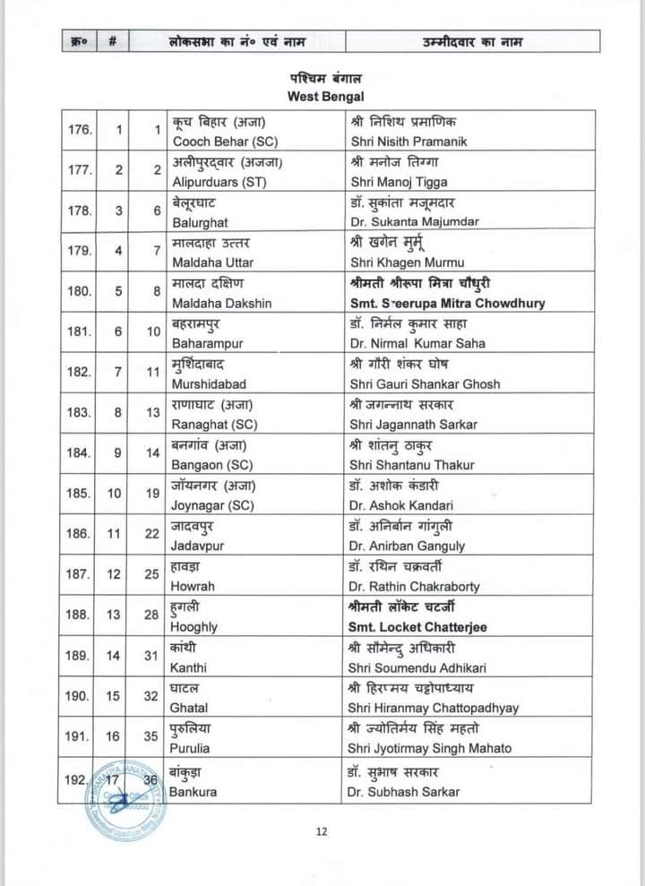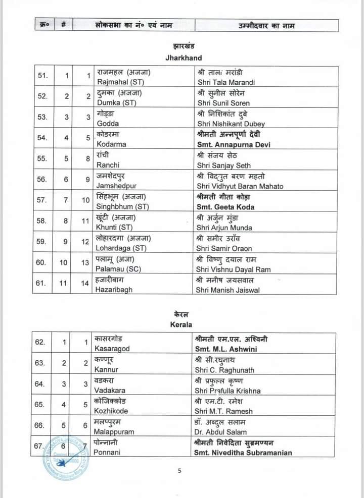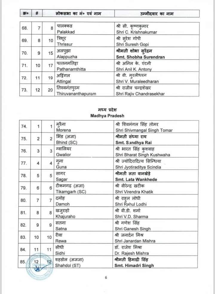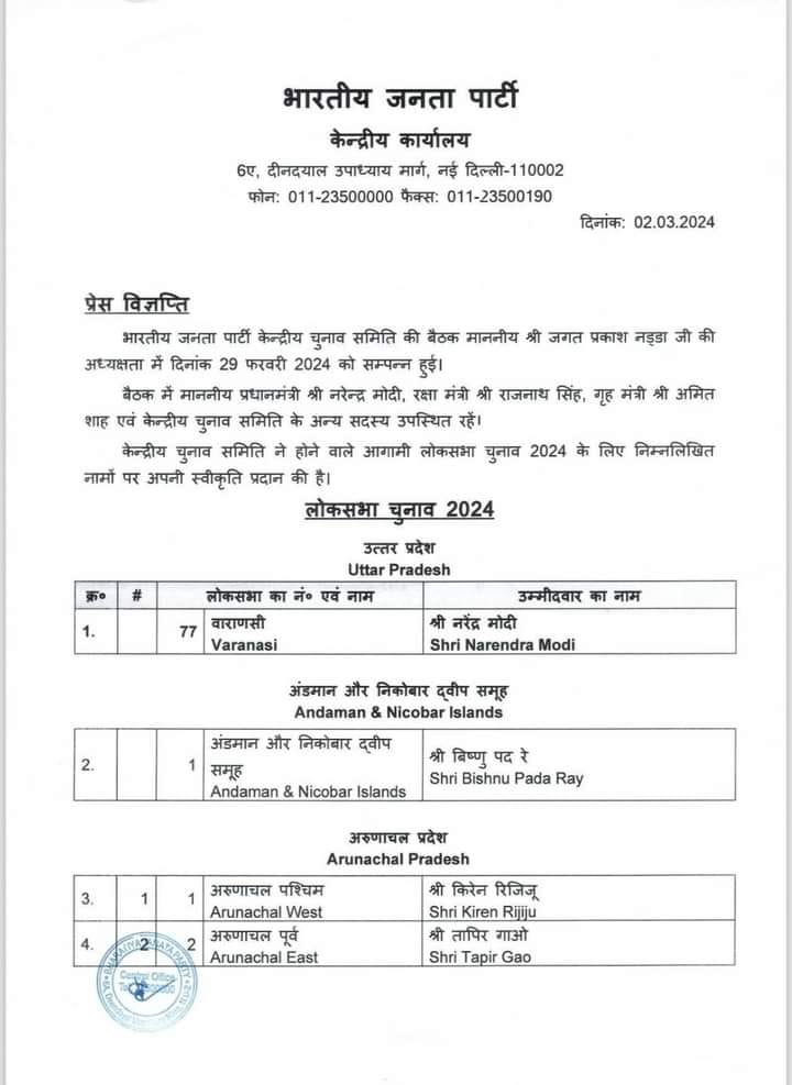 केन्द्रीय चुनाव समिति ने होने वाले आगामी लोकसभा चुनाव 2024 के लिए जिन नामों पर अपनी स्वीकृति प्रदान की थी उनके नाम आज पहल सूची में जारी कर दिए गए है। बीजेपी राष्ट्रीय महासचिव विनोद तावड़े ने कहा “16 राज्य और 2 केंद्र शासित प्रदेश में से 195 सीट्स पर चुनाव उम्मीदवारों के नाम तय हो गए हैं। 34 केंद्रीय एंव राज्य मंत्रियों के नाम भी इस सूची में हैं। 195 उम्मीदवारों की लिस्ट में मध्य प्रदेश के 24 उम्मीदवारों के नाम हैं। वहीं उत्तर प्रदेश से 51, पश्चिम बंगाल से 26, गुजरात से 15, राजस्थान से 15, केरल से 12, तेलंगाना से 9, असम की 14 में से 11 , झारखंड से 11 , छत्तीसगढ़ से 11, दिल्ली से 5 , जम्मू कश्मीर से 2, उत्तराखंड से 3 ,अरूणाचल प्रदेश 2, गोवा से 1 , त्रिपुरा 1, अंडमान-निकोबार से 1 और दमन दीव से 1 सीट की घोषणा हुई है।