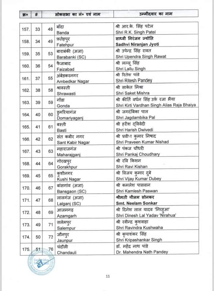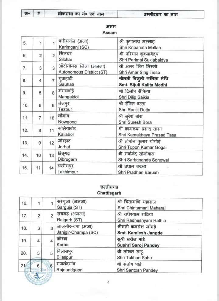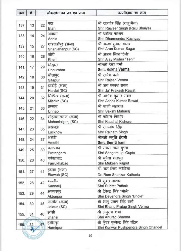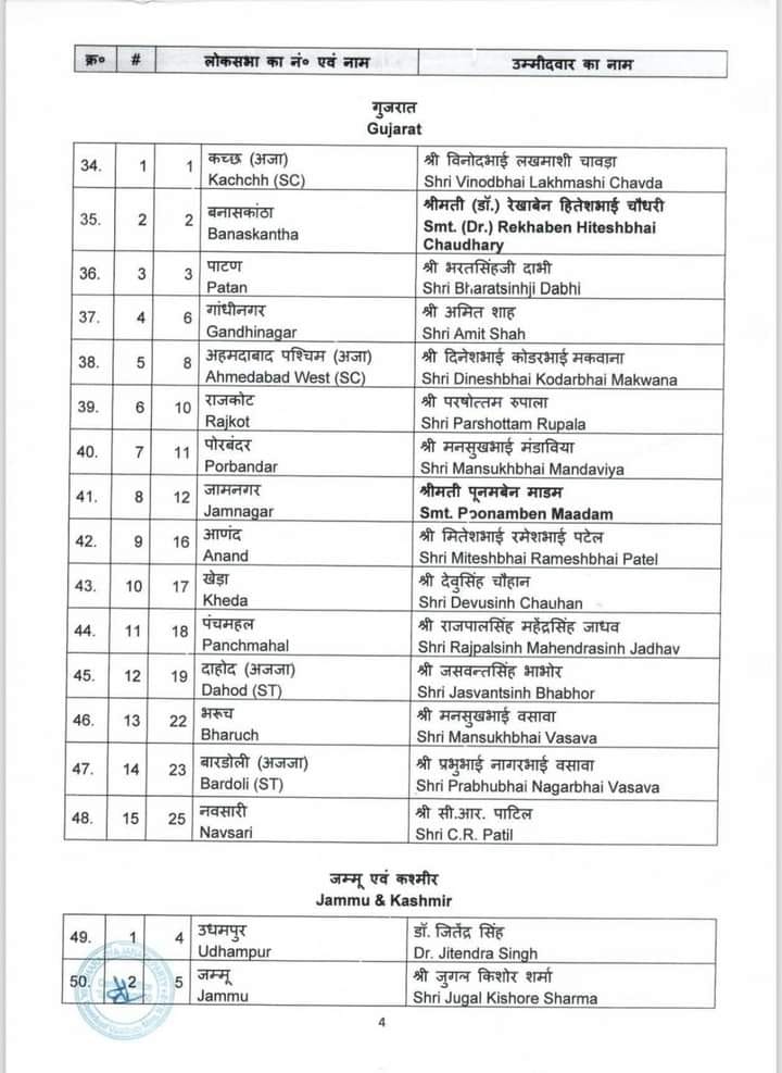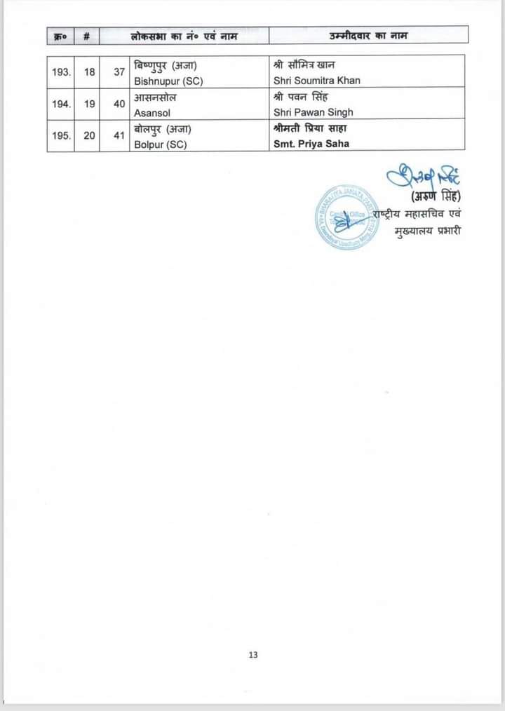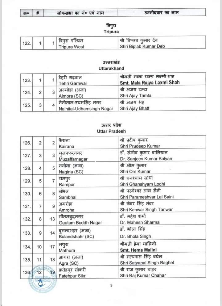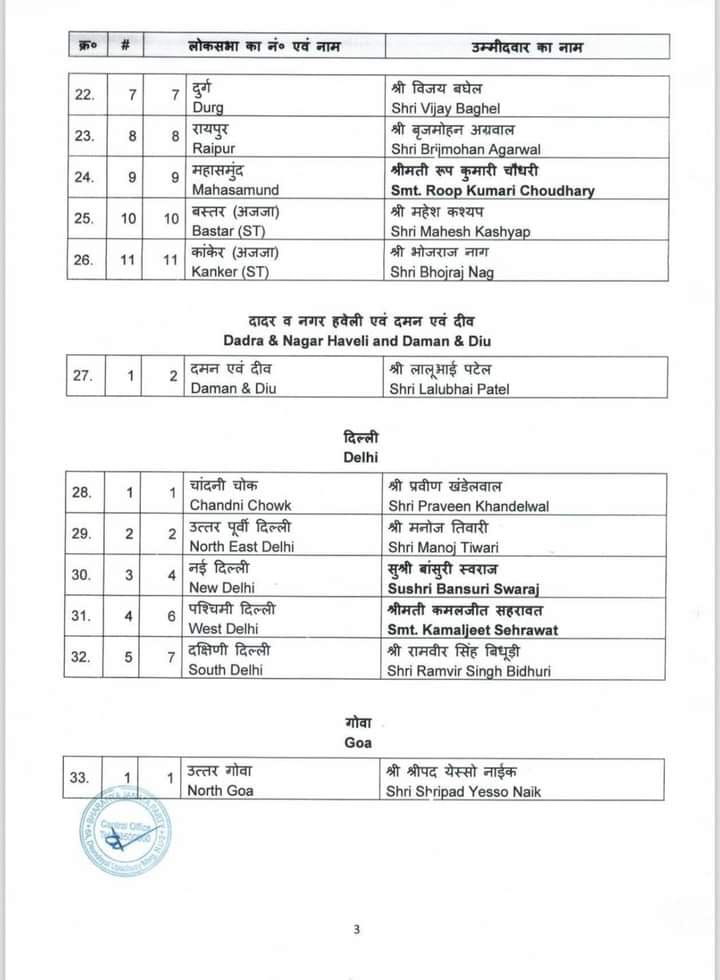 केन्द्रीय चुनाव समिति ने होने वाले आगामी लोकसभा चुनाव 2024 के लिए जिन नामों पर अपनी स्वीकृति प्रदान की थी उनके नाम आज पहल सूची में जारी कर दिए गए है। बीजेपी राष्ट्रीय महासचिव विनोद तावड़े ने कहा “16 राज्य और 2 केंद्र शासित प्रदेश में से 195 सीट्स पर चुनाव उम्मीदवारों के नाम तय हो गए हैं। 34 केंद्रीय एंव राज्य मंत्रियों के नाम भी इस सूची में हैं। 195 उम्मीदवारों की लिस्ट में मध्य प्रदेश के 24 उम्मीदवारों के नाम हैं। वहीं उत्तर प्रदेश से 51, पश्चिम बंगाल से 26, गुजरात से 15, राजस्थान से 15, केरल से 12, तेलंगाना से 9, असम की 14 में से 11 , झारखंड से 11 , छत्तीसगढ़ से 11, दिल्ली से 5 , जम्मू कश्मीर से 2, उत्तराखंड से 3 ,अरूणाचल प्रदेश 2, गोवा से 1 , त्रिपुरा 1, अंडमान-निकोबार से 1 और दमन दीव से 1 सीट की घोषणा हुई है।