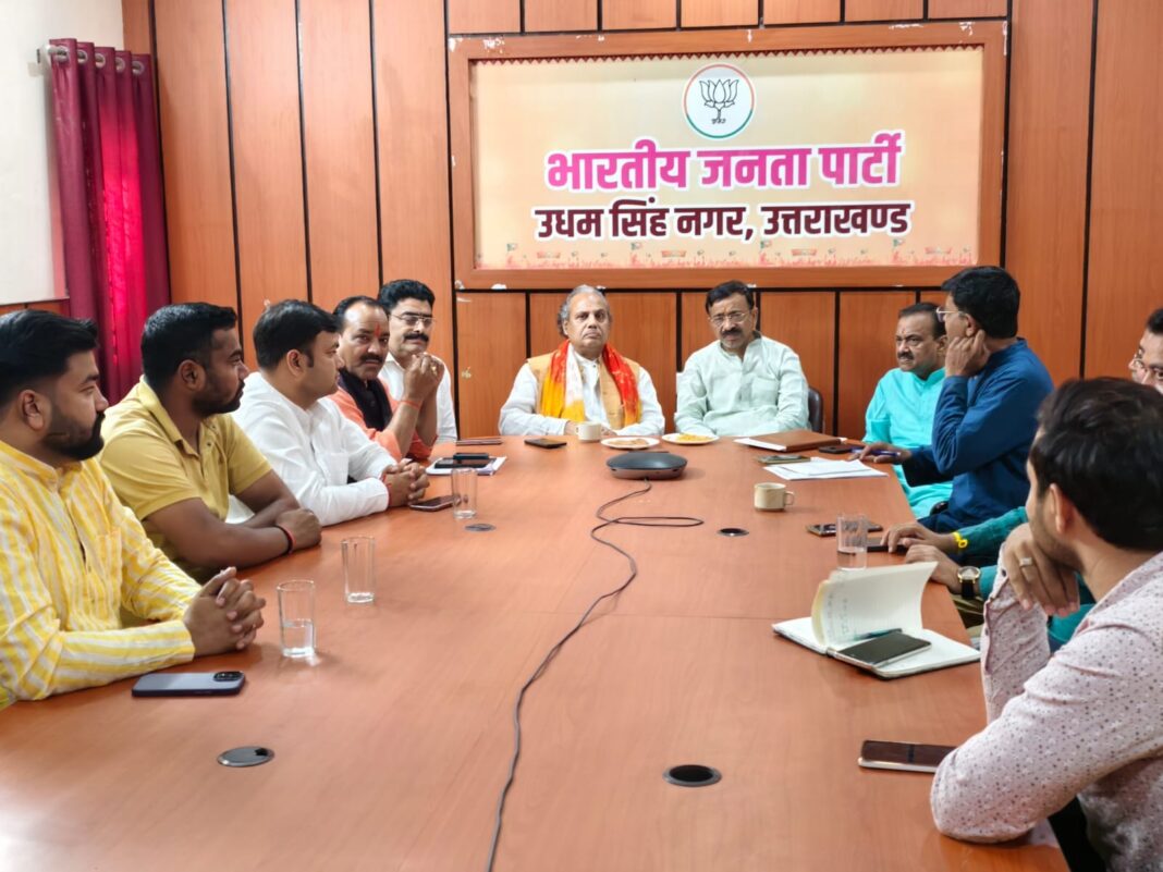 न्यूज प्रिन्ट,रुद्रपुर। भारतीय जनता पार्टी के जिला कार्यालय रुद्रपुर में एक संगठनात्मक बैठक आयोजित की गई, जिसमें विभिन्न महत्वपूर्ण मुद्दों पर विस्तार से चर्चा की गई। बैठक की अध्यक्षता जिलाध्यक्ष कमल जिंदल ने की। बैठक में मुख्य वक्ता के रूप में आपदा प्रबंधन मंत्री विनय रुहेला उपस्थित रहे। उन्होंने वर्ष 2027 में होने वाले आगामी चुनावों को ध्यान में रखते हुए संगठनात्मक रणनीति पर चर्चा की तथा कार्यकर्ताओं को सक्रिय होने का आह्वान किया। उन्होंने कहा कि अब चुनाव का समय आ गया है और सभी कार्यकर्ता पूरी ऊर्जा के साथ मैदान में उतरें।