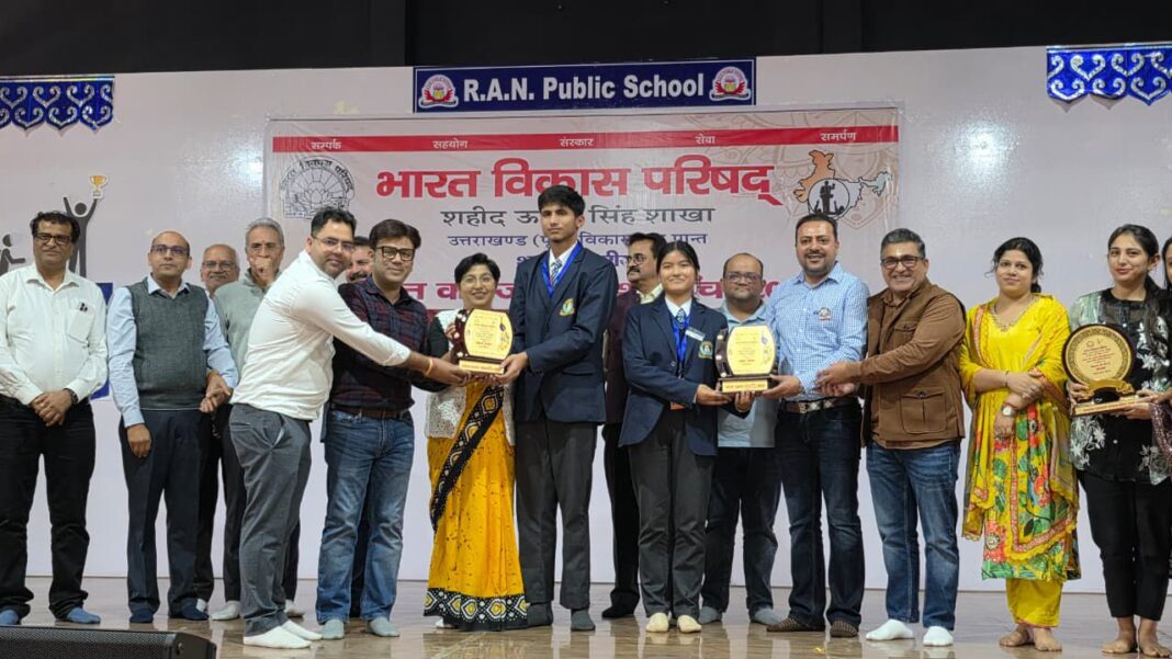 रुद्रपुर। आर ए एन पब्लिक स्कूल भूरारानी में भारत विकास परिषद की शहीद ऊधम सिंह शाखा रुद्रपुर द्वारा “भारत को जानो प्रश्नमंच प्रतियोगिताज् का आयोजन 1& नवम्बर 2025 को किया गया। कार्यक्रम की शुरुआत दीप प्रज्वलन और वंदे मातरम् के साथ हुई। कार्यक्रम में क्षेत्रीय संयुक्त महासचिव नरेंद्र अरोरा, प्रांतीय संयोजक नेत्रदान संजय राधू, प्रांतीय संयोजक पर्यावरण विष्णु सक्सेना और पूर्व प्रांतीय अध्यक्ष विजय भूषण गर्ग विशेष अतिथि के रूप में शामिल हुए।