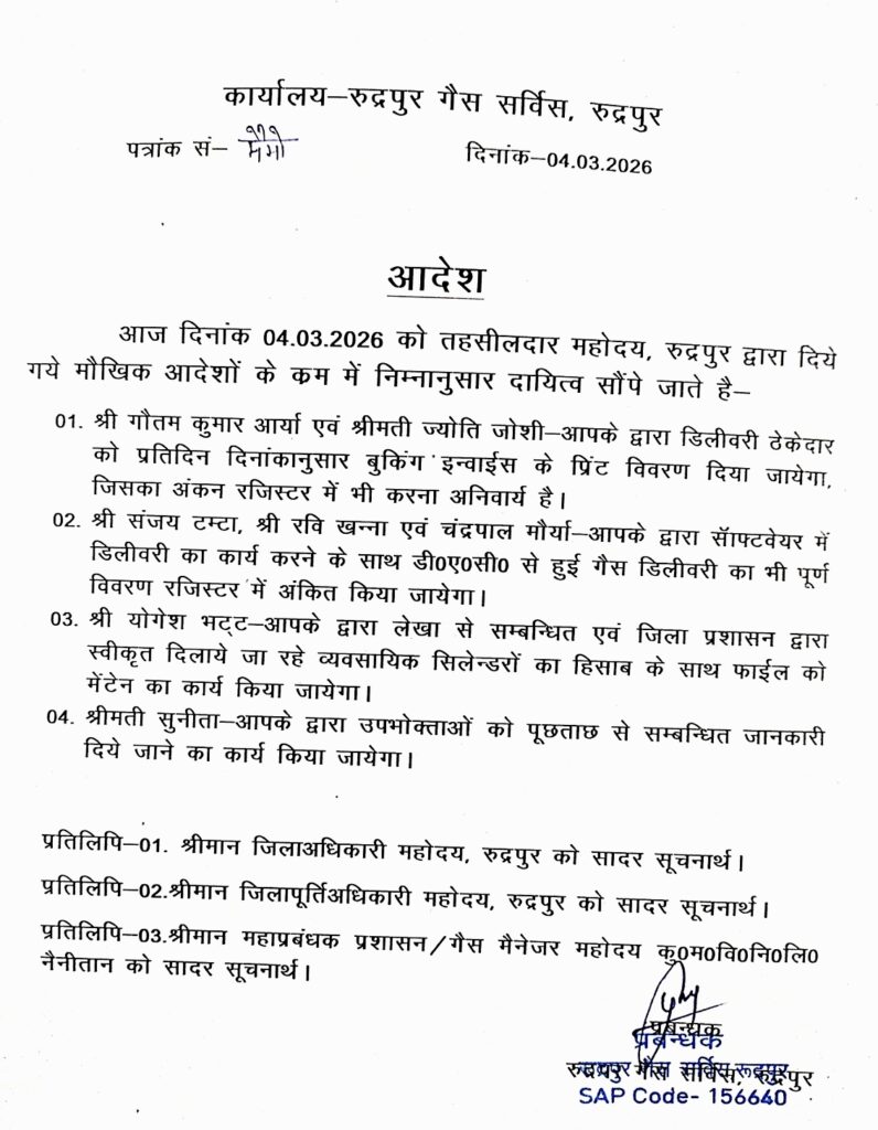 नई व्यवस्था को सुदृढ़ बनाने के लिए गैस एजेंसी के भीतर तकनीकी समस्याओं और ओटीपी संबंधी दिक्कतों के त्वरित समाधान हेतु दो विशेष कार्मिकों को नियुक्त किया गया है। अब किसी भी उपभोक्ता को अनावश्यक रूप से पर्ची कटवाने के लिए लाइन में नहीं खड़ा होना पड़ेगा। कार्यक्षमता बढ़ाने के लिए कर्मचारियों के बीच स्पष्ट कार्य विभाजन किया गया है। गौतम कुमार आर्या और ज्योति जोशी को प्रतिदिन बुकिंग इन्वाइस और रजिस्टर मेंटेन करने का जिम्मा दिया गया है, जबकि संजय टम्टा, रवि खन्ना और चंद्रपाल मौर्या सॉफ्टवेयर और डीएसी डिलीवरी के विवरण की निगरानी करेंगे। व्यावसायिक सिलेंडरों के हिसाब-किताब के लिए योगेश भट्ट और उपभोक्ताओं की शिकायतों के त्वरित निस्तारण हेतु सुनीता को जिम्मेदारी सौंपी गई है।