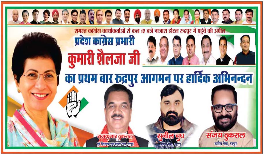 न्यूज प्रिन्ट, रुद्रपुर। उत्तराखंड कांग्रेस की प्रदेश प्रभारी कुमारी शैलजा कल रुद्रपुर पहुंचेंगी। इसके लिए कांग्रेस संगठन ने तैयारियां तेज कर दी हैं। जिलाध्यक्ष हिमांशु गावा ने बताया कि यह कार्यक्रम भूरारानी स्थित नजारा बैंकट हॉल में दोपहर 12 बजे से आयोजित किया जाएगा। बैठक में प्रदेश अध्यक्ष गणेश गोदियाल, नेता प्रतिपक्ष यशपाल आर्य, प्रदेश के सह-प्रभारी और जनपद के सभी विधायक भी उपस्थित रहेंगे।